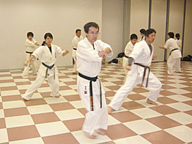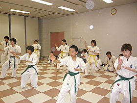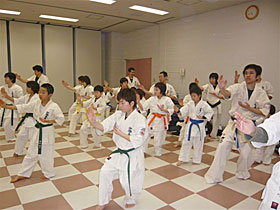 朝食をすませ、9時からは東総合スポーツセンターヘ移動し3時間もの型の稽古が行われました。一日目と同様に三班に分かれての班別稽古です。一日目に覚えた型より更に次の型を覚えたり、一日目に覚えた型を練りこんでいく作業にはいりました。